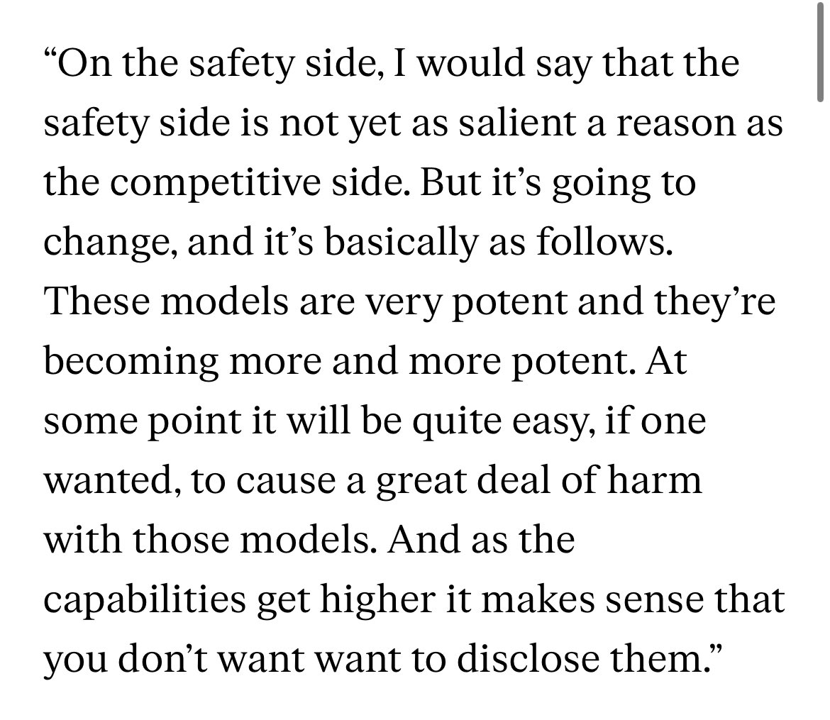 To be clear, I think OpenAI will prove to be one of the most positively impactful organisations of this generation and, although it’s against the spirit in which they were founded, it’s fine for them to not release information. I just wish they’d just be more honest that they’re doing to maintain a competitive edge and they no longer believe in being open (mostly) for that reason currently Which is fair enough if they want to be a profit seeking enterprise - Ilya Sutskever pretty much said this in a recent interview. There’s probably a time and a place for hand wavey safety excuses but not disclosing this kind of information is almost certainly not it