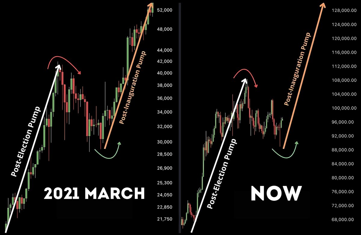 从历史上看,三月是爆发的月份。 每四年,在选举前夕,股票和加密货币市场都会出现上涨。 这是与市场情绪和经济政策相关的反复出现的模式。 这个循环看起来是这样的: ✅选举后刺激→ 📉修正→ 🚀就职典礼后刺激