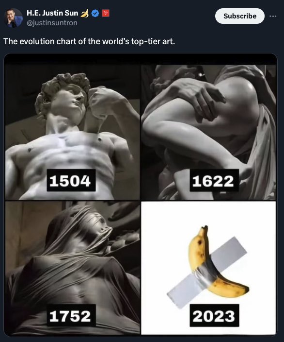 3. The $6.2M Banana In November 2024, Sun took his flair for drama into the art world. He purchased “Comedian” by Maurizio Cattelan. A banana duct-taped to a wall—for a staggering $6.2 million at Sotheby’s. Sun didn’t just buy the artwork—he made it part of his own story: