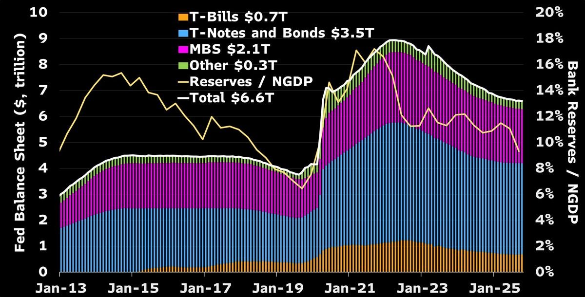 联邦公开市场委员会结束量化紧缩政策,资产负债表规模达6.6万亿美元,其中: 短期国库券7000亿美,中期和长期国债3.5万亿,MBS2.1万亿,其他3000亿 其中最重要的一个指标是反映市场流动性指标,或者说是联储量化宽松的指标:商业银行存放联储的储备金余额/名义GDP的比例,目前这个指标低于历史均值