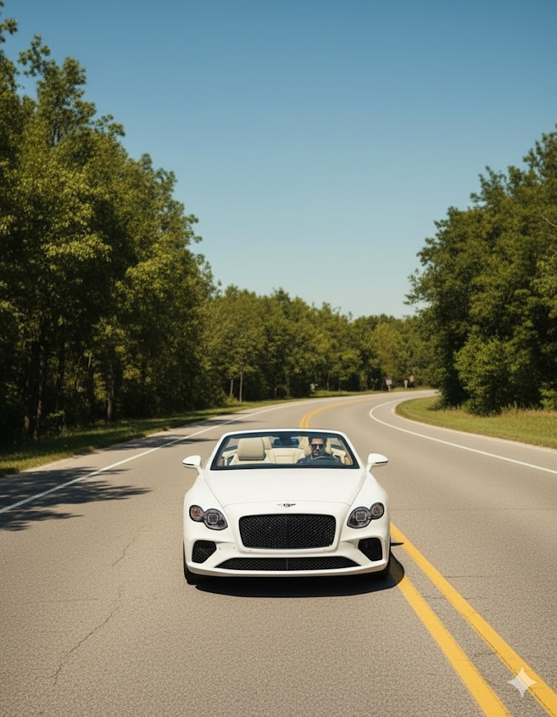 提示词 5: '在豪华敞篷车后排拍摄一张极具戏剧性的肖像。 驾驶座上的年轻男子侧身面向相机,穿着黑色皮夹克和白T恤。 阳光下,他的卷发随风轻轻飘动。'