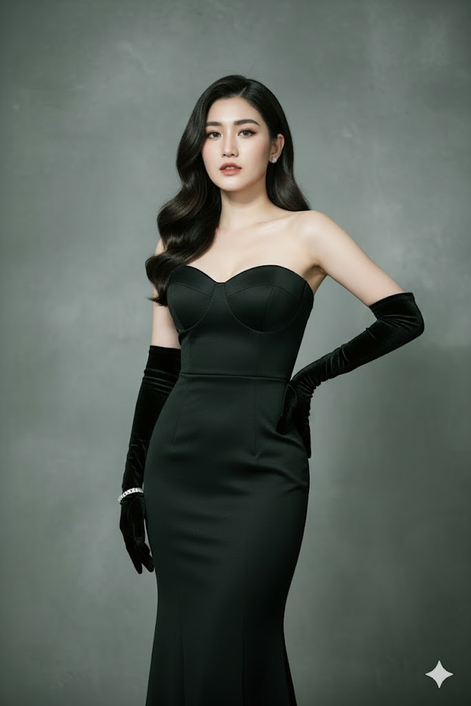 提示词 8: '优雅的背身照,身穿黑色无肩带晚礼服。 搭配黑色天鹅绒长手套,头发松散地披散。 自信、优雅的表情,背景为素雅灰色。'